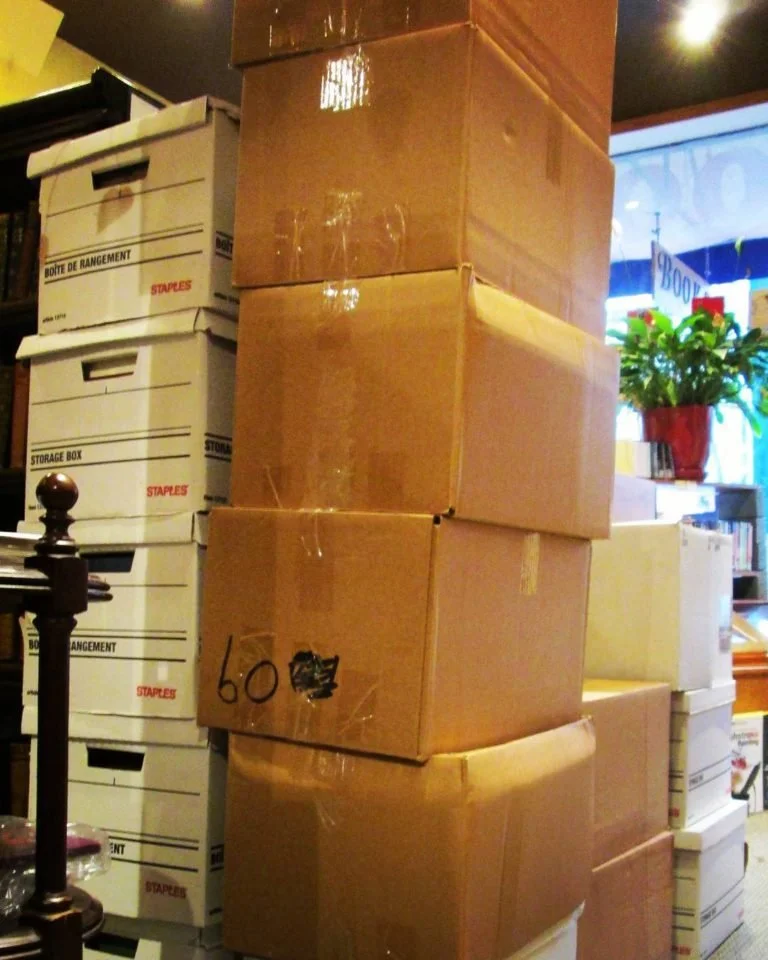 This is what a big shipment of new stock looks like before it hits our shelves. The front desk is behind there somewhere…